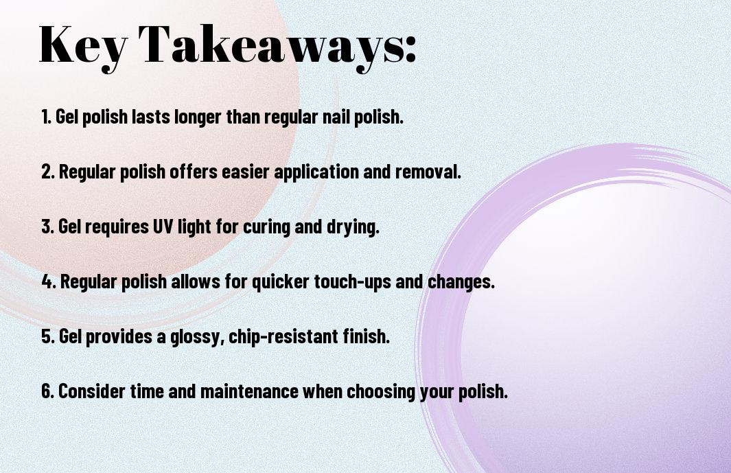 Your choice between gel and regular nail polish can impact your nail health. Regular nail polish is easier to remove and typically less damaging to your nails when used correctly. However, gel polish requires a UV or LED lamp for curing, raising concerns about potential skin exposure to UV light. Additionally, prolonged use of gel formulas can lead to nail brittleness or weakening. It’s vital to consider these factors and prioritize nail care in your nail routine, no matter your choice.