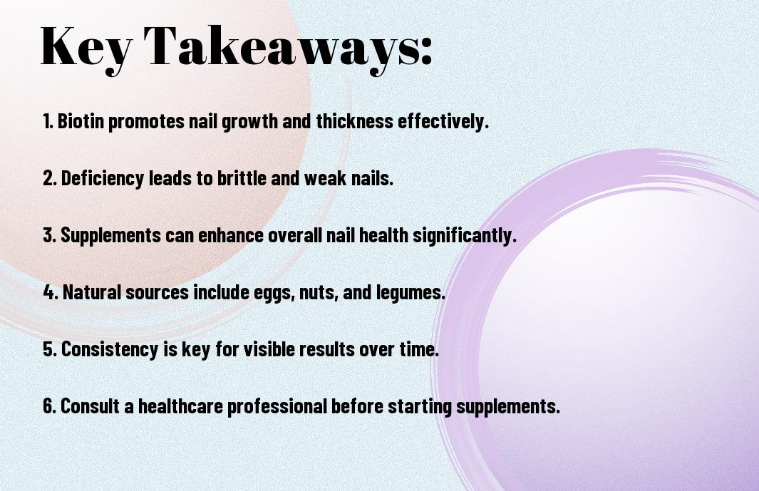 About 90% of your nails are made up of keratin, protein fibers vital for nail integrity. Biotin stimulates keratin production, enhancing the overall structure and strength of your nails. When you incorporate biotin into your diet or use supplements, you may notice a significant improvement in your nails’ durability and appearance. This can lead to smoother, healthier nails that are less likely to show damage.