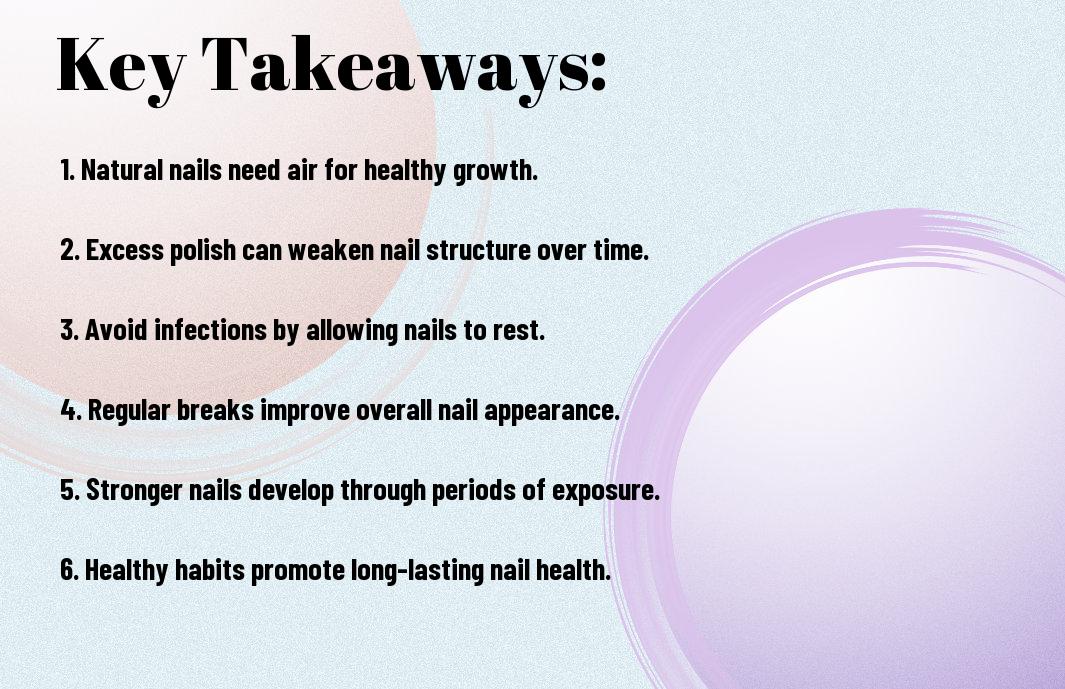 To wrap up, allowing your nails to breathe is crucial for their health and your overall nail care routine. By taking breaks from nail polish and treatments, you enable your nails to recover, maintain their strength, and prevent issues like discoloration and brittleness. Regularly incorporating downtime into your nail care regimen ensures that your nails remain vibrant and resilient. Prioritizing this aspect of nail maintenance will ultimately lead to improved nail health and a more polished look when you choose to adorn them again.